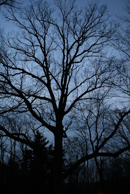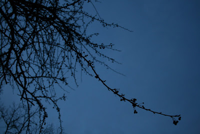 Tonight, a study in blues and branches, product of my getting reacquainted with a silenced campus. At dusk the blues were beautiful, and all the trees behind my windows cast their black traces into our darkening. I'm going easy on my words tonight, because tomorrow I want to tell you a story. Or maybe sing you a song. I haven't quite figured out yet how I want to crack into this particular star.
