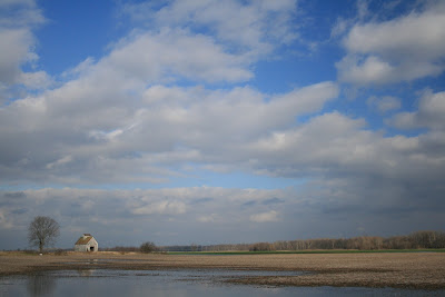 Soon I will leave these fields for my own fields, going back to my own barns, my own furrows and floods, my landscape, my hills and woods. This afternoon birds dropped from a wire like leaves, to dip and turn in a diving cloud, as I searched for broken-backed barns. Rivers wound out from under the fields and rippled the skies back to themselves. And the word comes from home that the rain there continues.