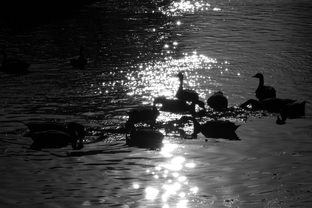 Then there was the night I stopped on Trinity Bridge without anyone. Stopped because there were the geese again, some coming single-file toward others clustered tightly around a floating light raft of willow leaves. And clacking together with their great black beaks, making a sound like balsawood ice cream spoons snapping, like wooden noisemakers making the same noise over and over. It was 4:30 and dark. I flattened myself to the bridge's stone and peered down at the geese, intent on pulling whatever they could out of those floating leaves. Down the river, goose after goose arrived at the bank and falumphed into the water and followed the others to the leaves. The full and finished geese peeled away, paddled upriver.