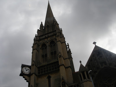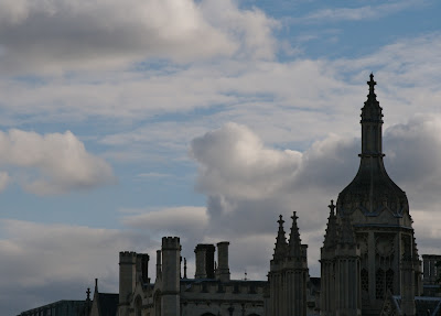 How could I have forgotten to tell you that as we walked through town we saw a startlingly low-key run on a bank? Across the street from where we walked, a long, thick queue of people seemed to be waiting for something. "Is something happening with the coffee?" my friend asked, since they initially seemed to be queueing around Costa Coffee. But next door to Costa is Cambridge's branch of the bank Northern Rock, which (though we didn't know it at the moment) was having a cataclysmically bad day. Having gotten a bailout from the Bank of England (lender of last resort), the bank faced queues all over England today as worried people showed up to empty their accounts and put their money into other, safer-seeming banks. Northern Rock shares lost 30% of their value today. Now, I've learned that the bank was writing mortgages worth six times their holders' incomes, a figure that (given the costs of living here) makes me catch my breath. Everyone in the queue we saw seemed reasonably cheery about it, which almost made us think that we weren't seeing what we were in fact pretty sure we were seeing. But we were indeed seeing it.