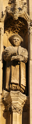 And now it's possible, even before evensong begins, to walk alongside King's College Chapel and observe its strange windows as they're illuminated from within. I am not schooled enough in stained glass to know whether it's common to build fragments of old windows into new ones. I will go out sometime this week with the monopod and try to get some better images of the disembodied heads and severed architectural details that punctuate the glass along the whole south side of the chapel. Handheld isn't going to get this job done.
